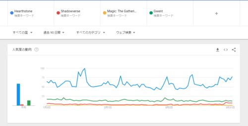 国内編に引き続き、海外においてのデジタルカードゲームのトレンドデータを見ていきます。 zunda2017.hatenablog.com 今度は直近90日間の日本を含む世界全体におけるGoogleトレンド(検索の動向、人気のようなもの)のデータです。比較したのは・Hearthstone…